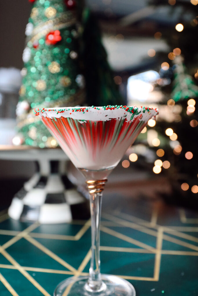 - Spread the frosting along the rim of a martini glass, or go all in and dip it for a full-on festive look. Next, plunge the glass into a cascade of sprinkles, creating a sugary spectacle. Set your dazzling glass aside as you prepare for the magic to unfold.