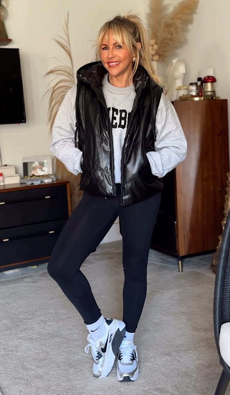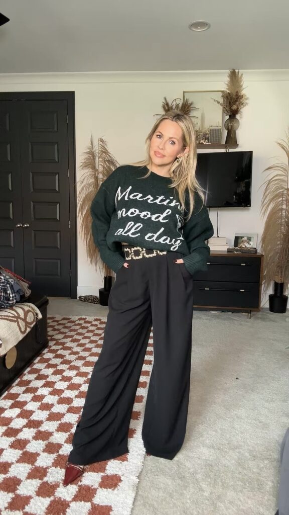One of my favorite finds this season is the green “Martini Mood All Day” sweatshirt. It’s relaxed, a little cheeky, and so easy to style. I paired it with the cutest plaid pleated skirt for a casual, festive look, and even added a trendy baseball cap. But then I switched it up with VICI’s high-waisted black pants and chain link waist belt for a more sophisticated vibe. These pants are seriously multifunctional — I can wear them with a turtleneck, a chunky sweater, or even a bodysuit when I want something sleeker.